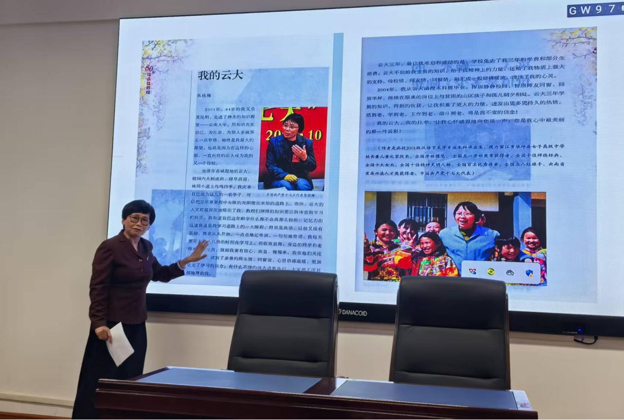 会议特别邀请了退休教师姜瑛向全体教职工讲述张桂梅老师在云南大学的求学经历。大家一同观看了《张桂梅思政大讲堂》,深刻体会了张老师的感人事迹与崇高精神。此次活动激励了全体教职工以杰出校友张桂梅老师为榜样,见贤思齐、奋发进取,力争成为“心中有信仰,脚下有力量”的新时代“四有”好老师。